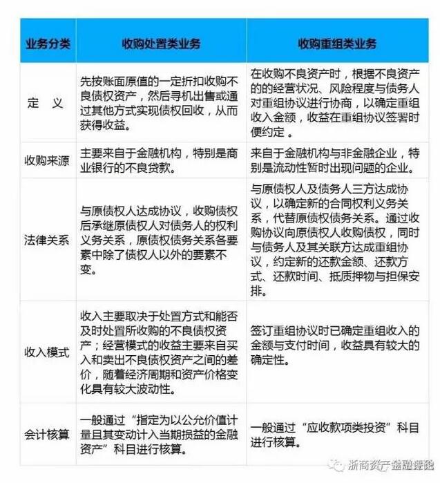 要了解這兩個科目,先得從資產管理公司不良債權資產經營業務類型說起。按照經營模式分類,資產管理公司不良債權資產經營業務分為收購處置類業務和收購重組類業務,兩者在收購來源、法律關系和收入模式、會計核算方面存在諸多不同,主要區別如下表: