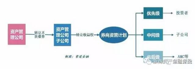 該業務模式通常為,資產管理公司將不良債權出售給子公司,子公司設立以該不良債權受益權為標的的資管計劃,并對資管計劃份額進行分級(一般分為優先級、中間級、劣后級),分別由資產管理公司、子公司和外部投資者共同出資購買,分級結構的設計主要是向外部投資者提供信用增級。