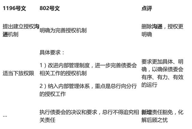 802號文具化授權要求,并新增責任豁免,該等機制的有效執行,能有效解決銀行分支機構參與債委會的深度及執行債委會決議的力度和效率問題,提高不良資產債務重組的效率和成功率。