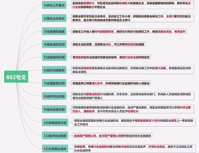 相較于1196號文,802號文進一步優化了債委會工作機制,并明確各方責任,最為亮眼的是建立問責機制,債務重組中各家銀行訴求不統一,信息不對稱,行動不一致將得到大大改善,有助于債權銀行精準發力、分類施策,形成合力,助力不良資產債務重組,最大限度幫助企業解困。