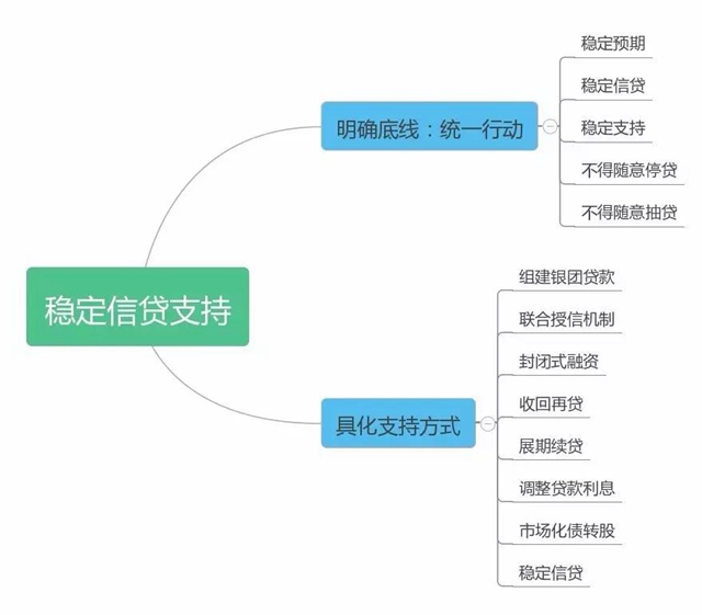 四、穩定信貸支持。金融債務重組期間,各銀行業金融機構要做到穩定預期、穩定信貸、穩定支持,一致行動,不得隨意停貸、抽貸;可通過必要的、風險可控的收回再貸、調整貸款利息、展期續貸、市場化債轉股等方式,最大限度的幫助困難企業實現解困。債務重組期間,為救助企業的需要,經債委會決議,可以采取穩定信貸的措施。