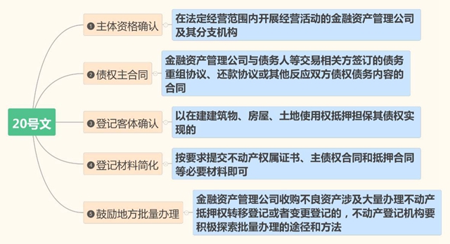 20號文中,強調不動產登記機構要積極探索批量辦理的途徑和方法,切實做到依法規范、高效便利,為金融資產管理公司健康發展提供有力保障。